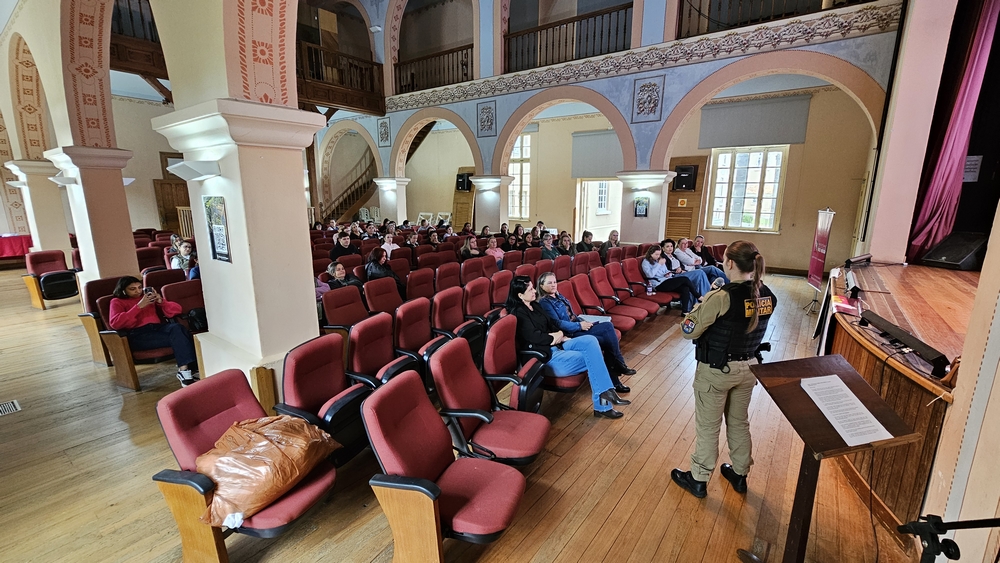 Foram abordados diversos temas, como os tipos de violência, o ciclo da violência doméstica, orientações de segurança, informações sobre a Medida Protetiva de Urgência (MPU) e as formas de contato e canais de denúncias.