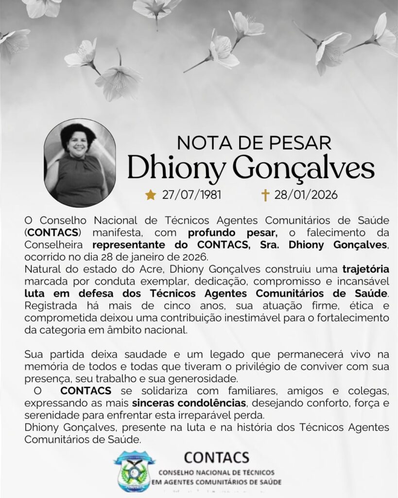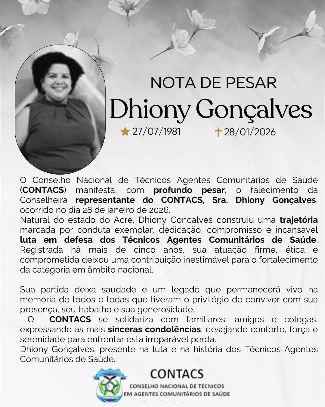 NOTA DE PESAR O Conselho Nacional de Técnicos Agentes Comunitários de Saúde (CONTACS) manifesta, com profundo pesar, o falecimento da Conselheira representante do CONTACS, Sra. Dhiony Gonçalves, ocorrido no dia 28 de janeiro de 2026. Natural do estado do Acre, Dhiony Gonçalves construiu uma trajetória marcada por conduta exemplar, dedicação, compromisso e